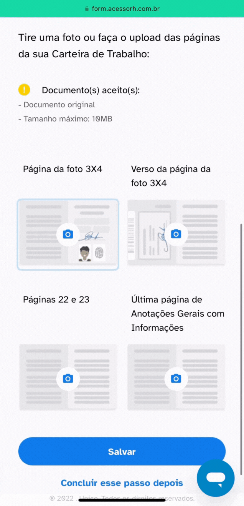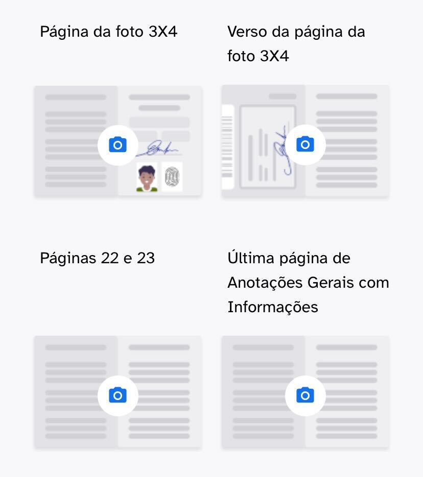 No caso da Carteira de Trabalho Física, é só tirar foto de acordo com cada campo solicitado.