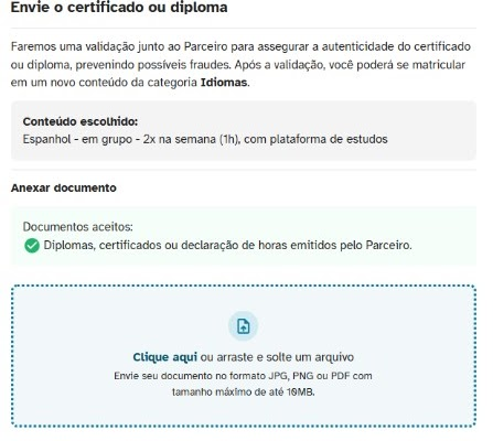 Passo 3: Localize o curso para o qual você recebeu o certificado. Haverá uma opção para anexar o certificado disponibilizado pela instituição. Clique nesta opção e prossiga com as instruções para carregar o arquivo de seu certificado.