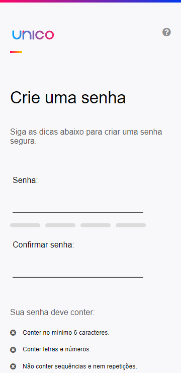 7. Digite sua nova senha e confirme. Lembre-se de seguir os requisitos informados. Pronto! Nova senha cadastrada.