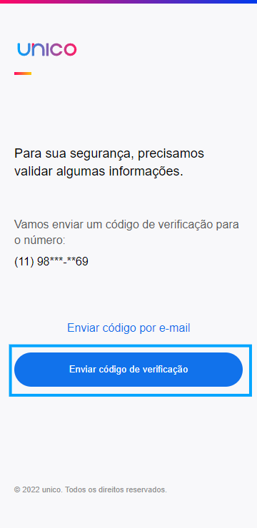 5. Aparecerá para você confirmar o canal de envio do código de autenticação, por padrão é escolhido o celular, mas você pode clicar na opção de e-mail, caso desejar.