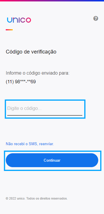 6. Insira o código de confirmação recebido por SMS e clique em "continuar".