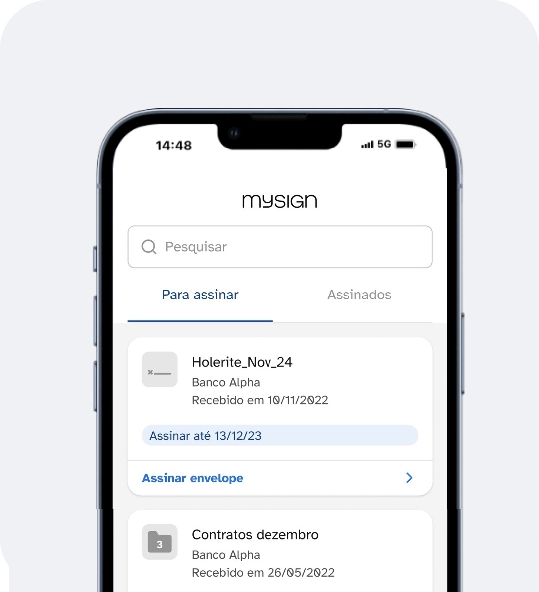 Após a leitura bem-sucedida da biometria, você poderá acessar o MySign e visualizar os documentos disponíveis para assinar, bem como os que já foram assinados.