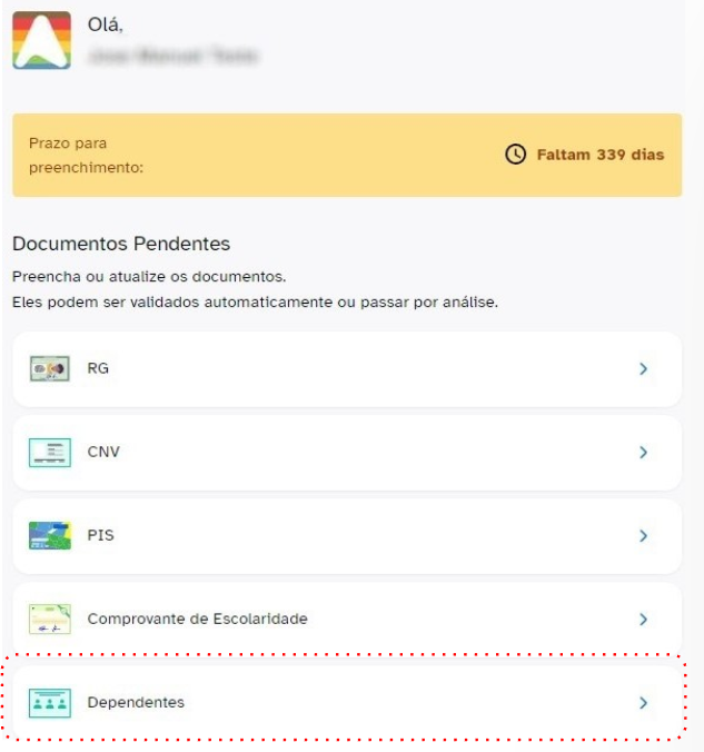1. Na tela inicial do cadastro, em “Documentos pendentes”, clique em "Dependentes".