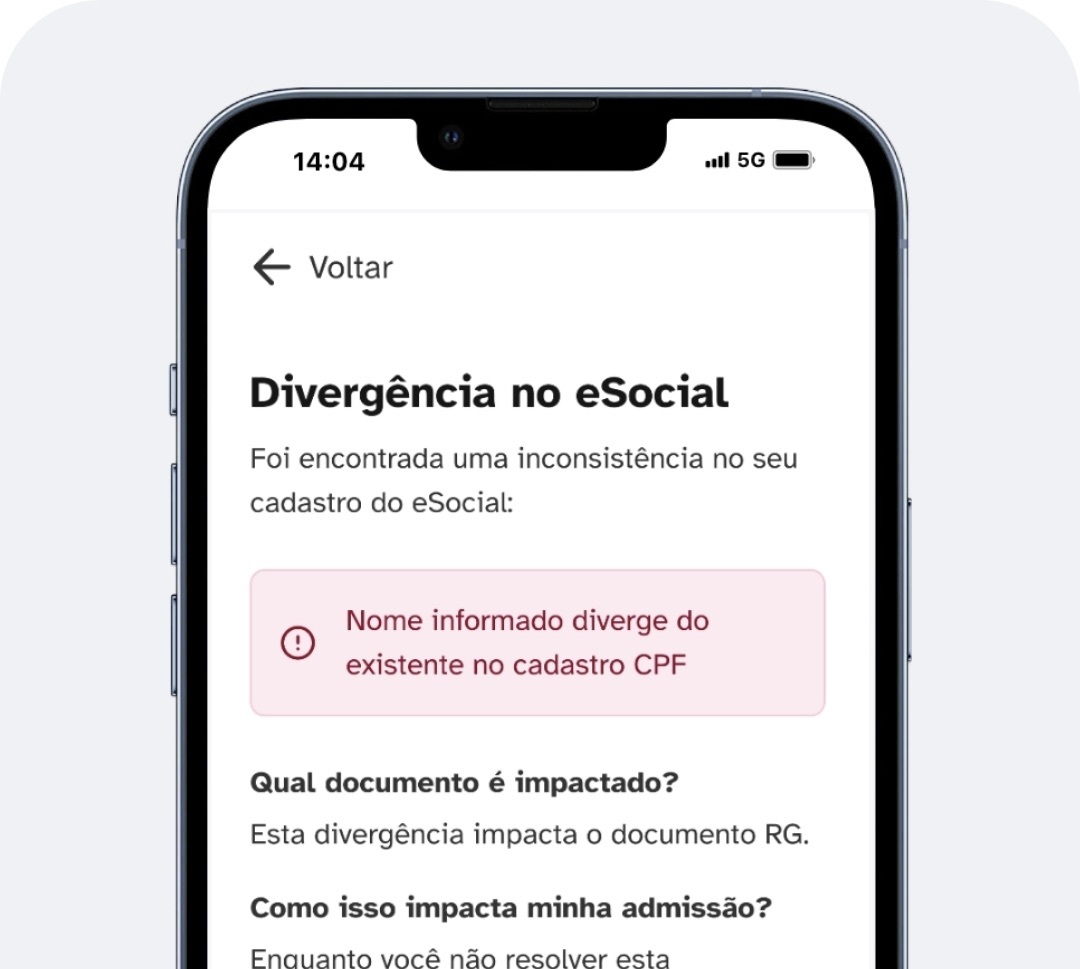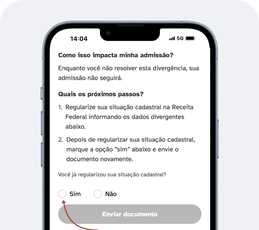 ◉ Sua admissão não poderá avançar até que a divergência com a Receita Federal seja resolvida.