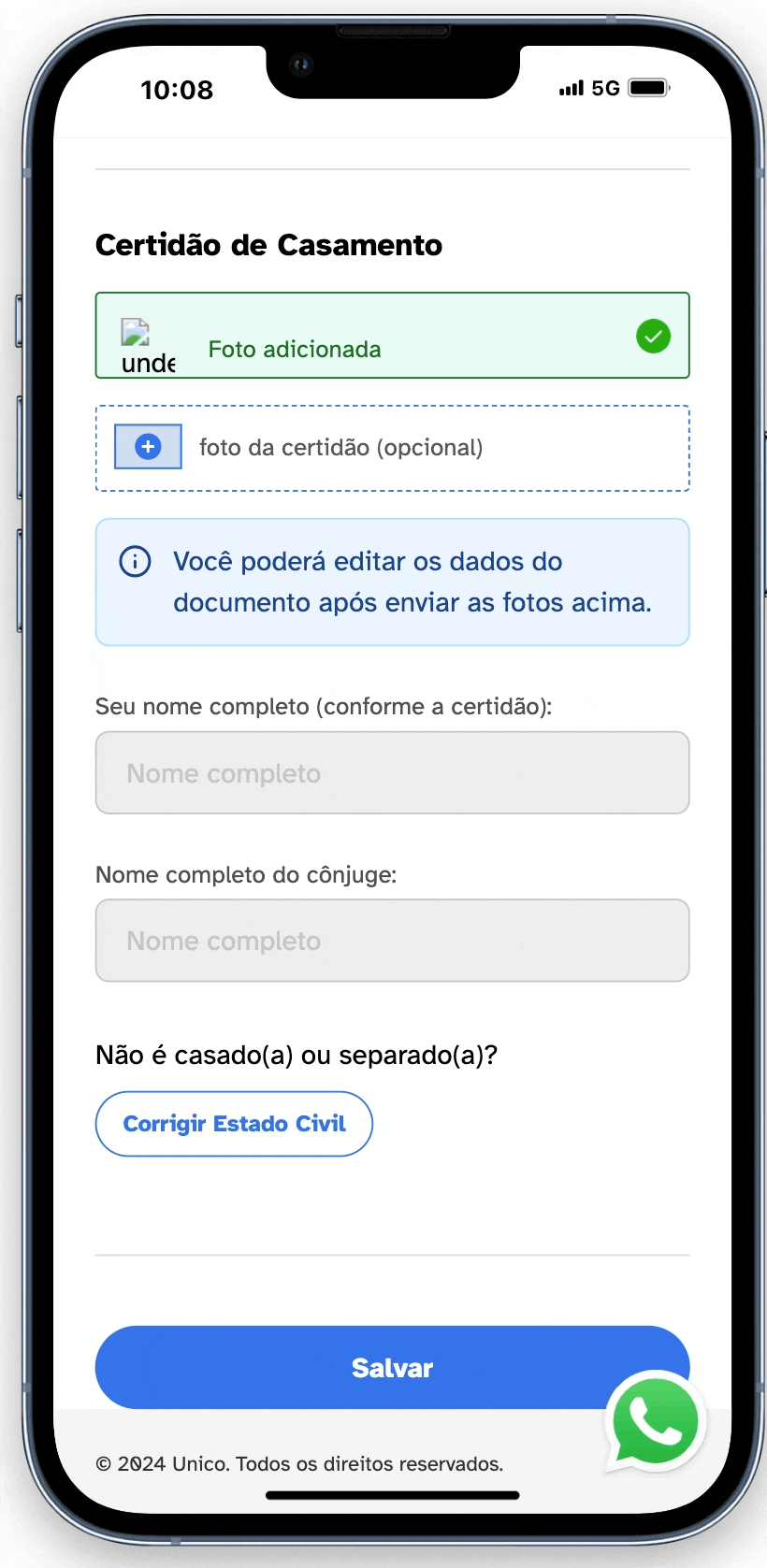 Este campo permanecerá bloqueado até que você envie a certidão de casamento. É fundamental que, após enviar a foto do documento, você aguarde a validação do sistema e não clique em salvar até que a leitura seja concluída.